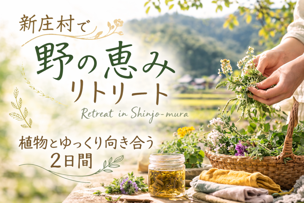 新緑がいちばん美しい5月の新庄村で 「野の恵みリトリート」を開催します。 草にふれ、摘み、染め、口にし、整える。 里山の植物とゆっくり関係を結び直す2日間。 よもぎオイルづくり、花曼荼羅、 植物を使ったセルフケアなど、 暮らしに寄り添う野の恵みを体験します。